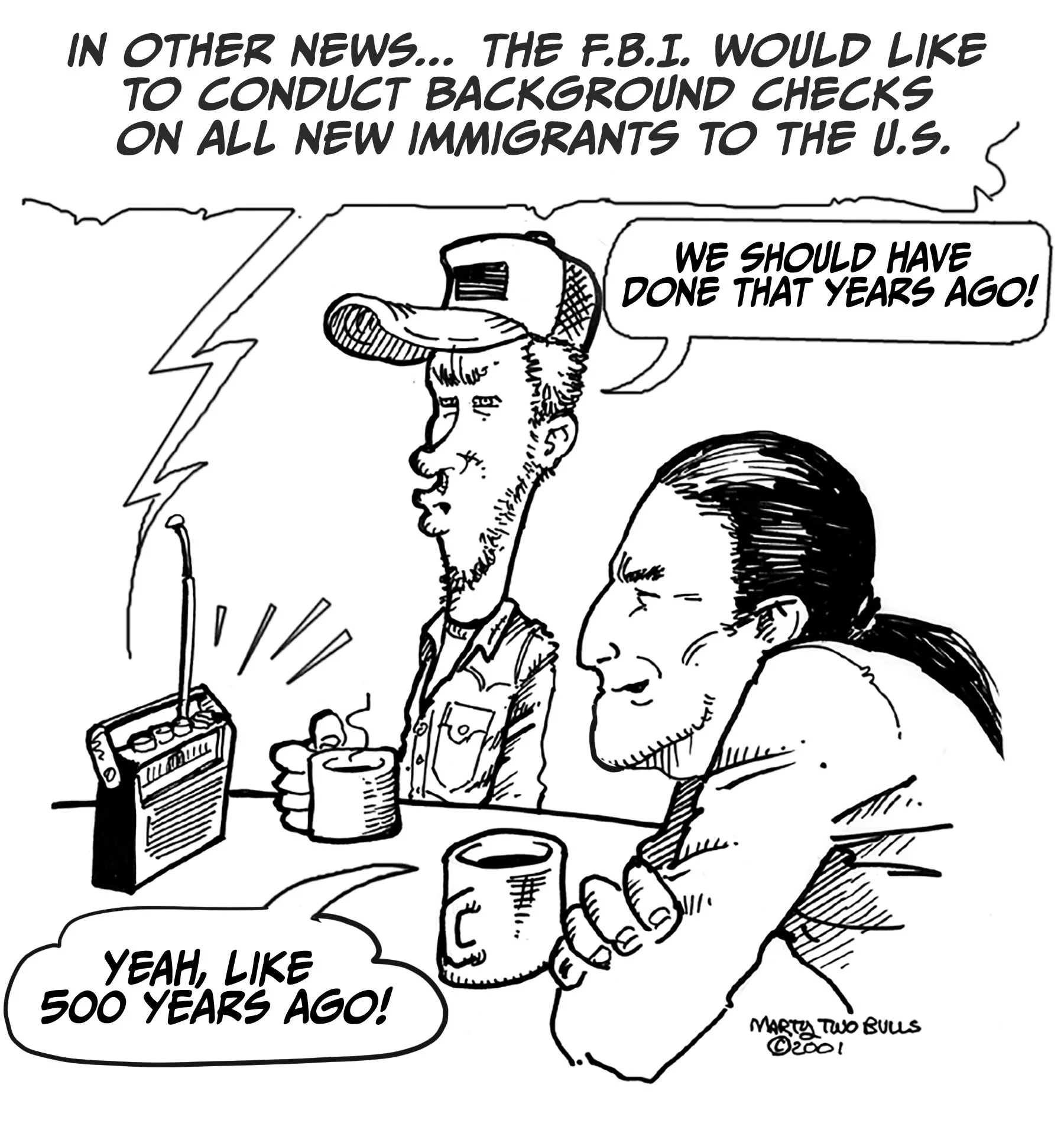 Two Bulls has been creating weekly cartoons for the Lakota Times newspaper serving the Pine Ridge Indian Reservation since December 2001. Having produced over six hundred editorial cartoons, he continues to submit work week after week. “For inspiration I keep up with local and national news feds, and antics of politicians provide an endless supply of satirical targets.”