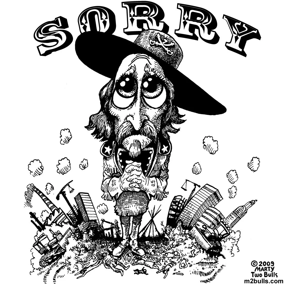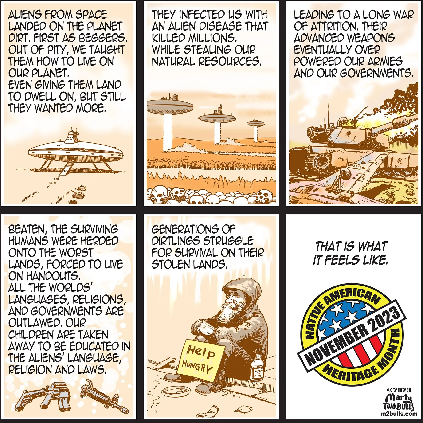 That is the sad truth of my people: we may last a hundred or two more years, but in the end, we will be gone. Blended in the mixing pot. But our blood will flow in future generations. My hope is that people will have in them enough of the native DNA that makes decisions that will effect not just the present, but how it will benefit future generations. A few hundred years from now, these cartoons will be one of the few records of how a native man saw his world. Lofty? That may be… all I ever wanted to do was make my uncles laugh.