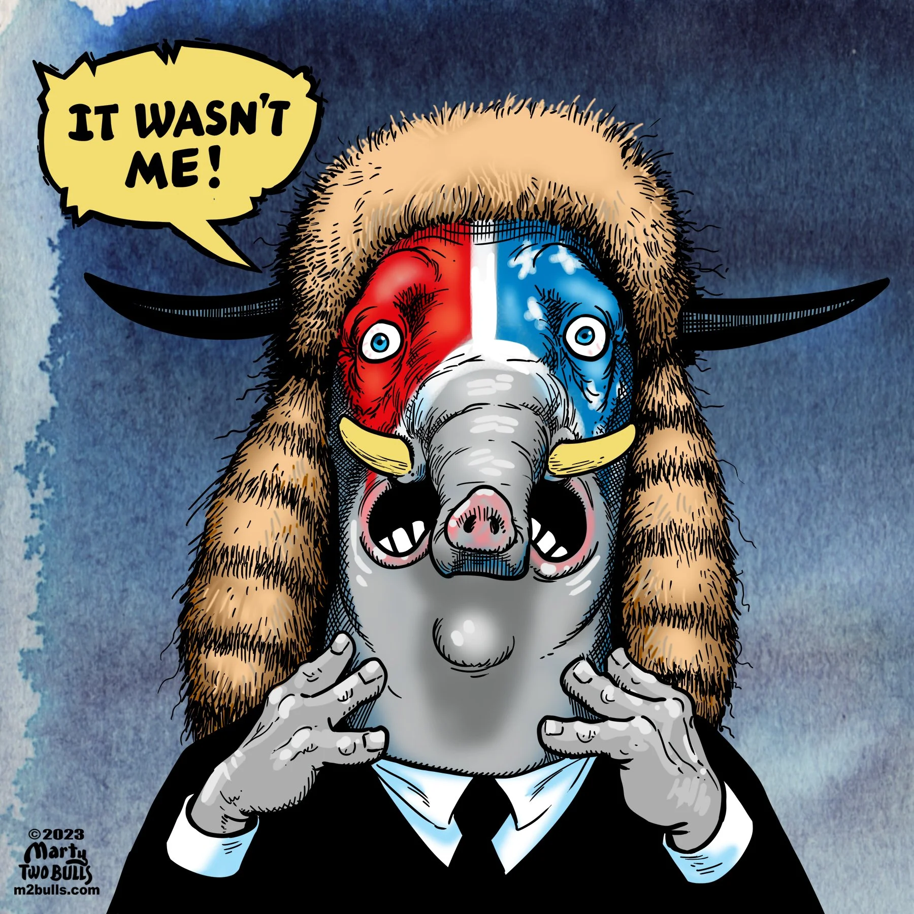 The creative process for the drawing is organic yet complicated; it can’t be faked or coerced. Composition encourages the reader’s eye to travel over the piece. Research into principal characters and equipment takes time. When I nail the caricature and feel confident, I will not label the drawing with the target’s name. Color when applicable must balance the layout and draw the eye to important aspects of the illustration. Overall, to be successful, the cartoon must be either funny or empathetic.